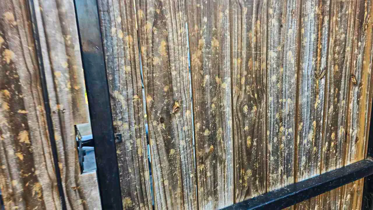 This picture shows spots on a wooden fence from hail. These spots are called spatter. They happen when big hail hits. The mark left behind is usually about half the size of the hail.